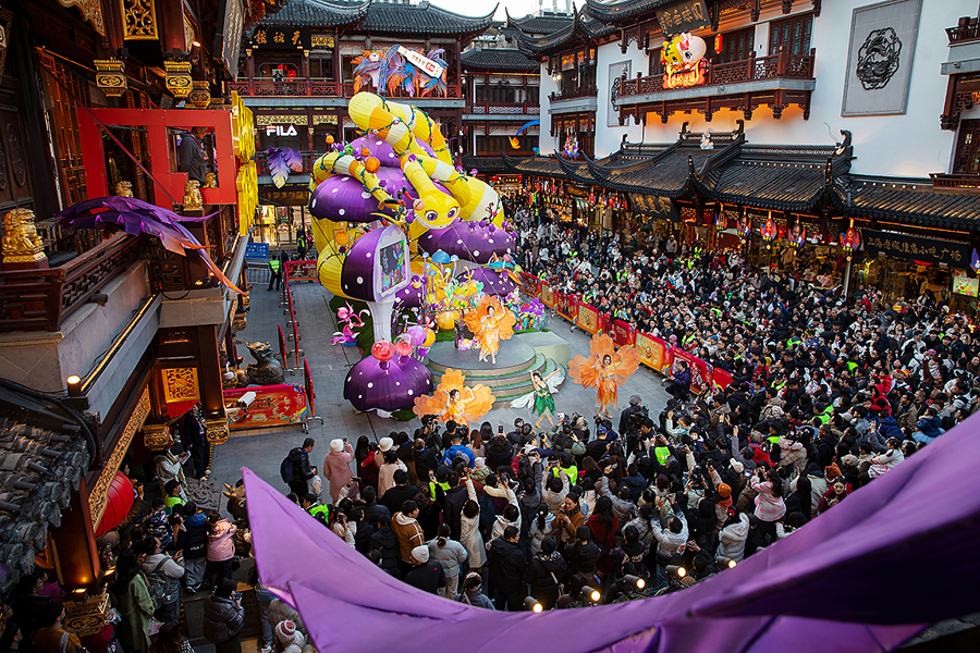 1月1日,豫园商城内,蛇年生肖主灯亮灯,吸引了市民游客围观。