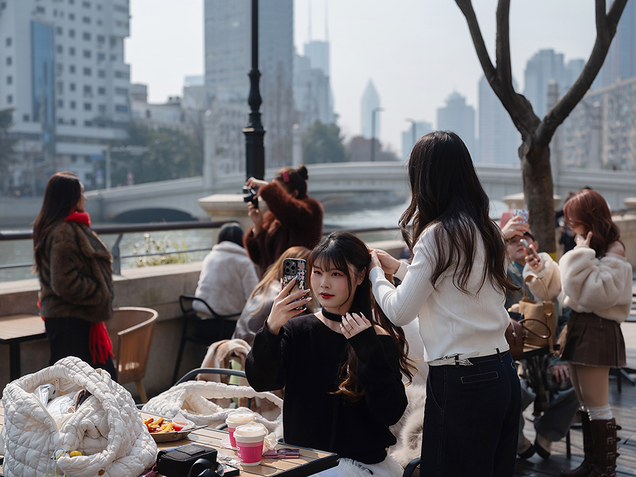 2月24日,苏州河边,爱美的“小姐姐们”梳妆打扮,准备趁着美好春光打卡拍照。