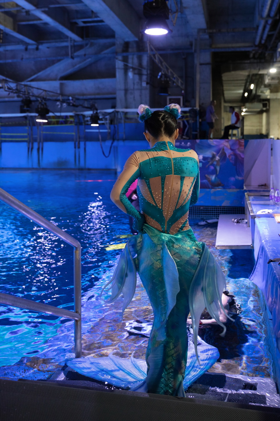 4月19日,上海海昌海洋公园里,2025中国美人鱼公开赛举行。选手穿上鱼尾,准备比赛。
