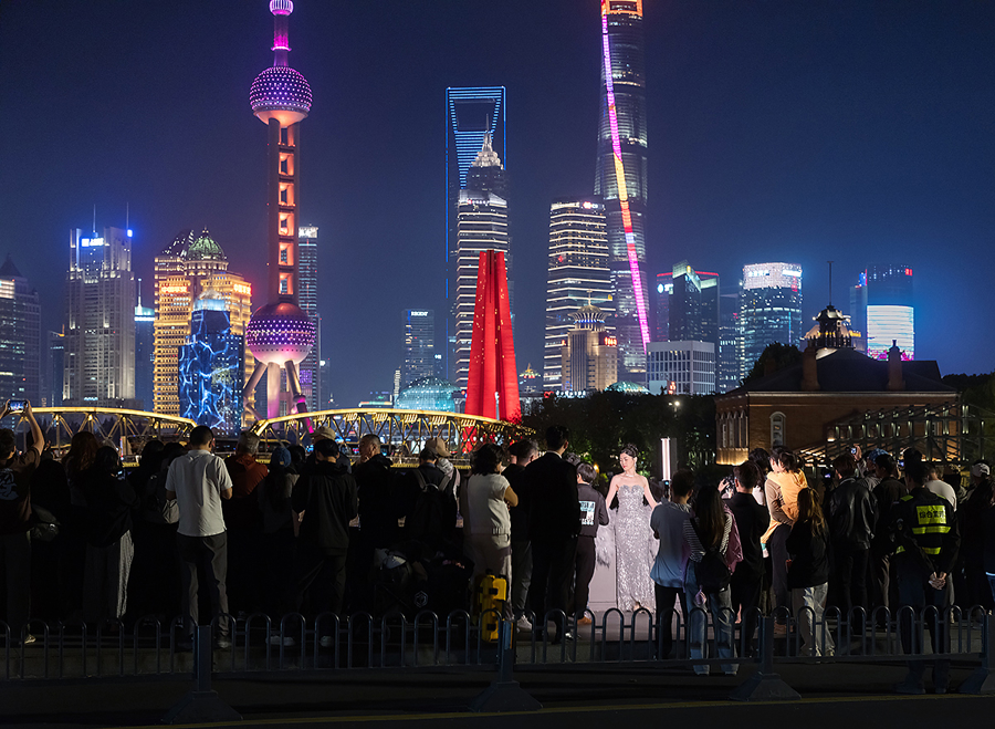 4月20日,一名女子在乍浦路桥上拍摄时尚大片,陆家嘴的璀璨华灯作为背景入镜,诠释了上海这座时尚之都的无限魅力。