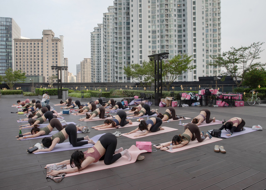 5月24日,天台上迎来瑜伽课。越来越多年轻人走到户外锻炼健身,寻求健康的生活方式。