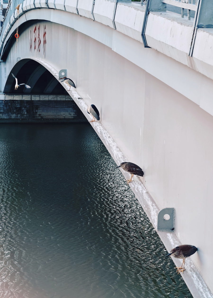 6月16日,山西路桥侧,多只鹭鸟“整齐列队”,伺机捕鱼。苏州河水治理后,两岸生态环境不断改善,鸟类越来越多。