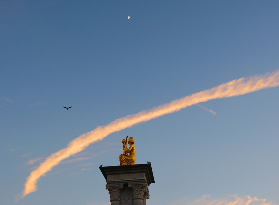 入夏后的申城常现水晶天。7月2日傍晚,月亮,归鸟,被夕阳照亮的飞机线和武宁路桥雕塑,构成了一幅画。
