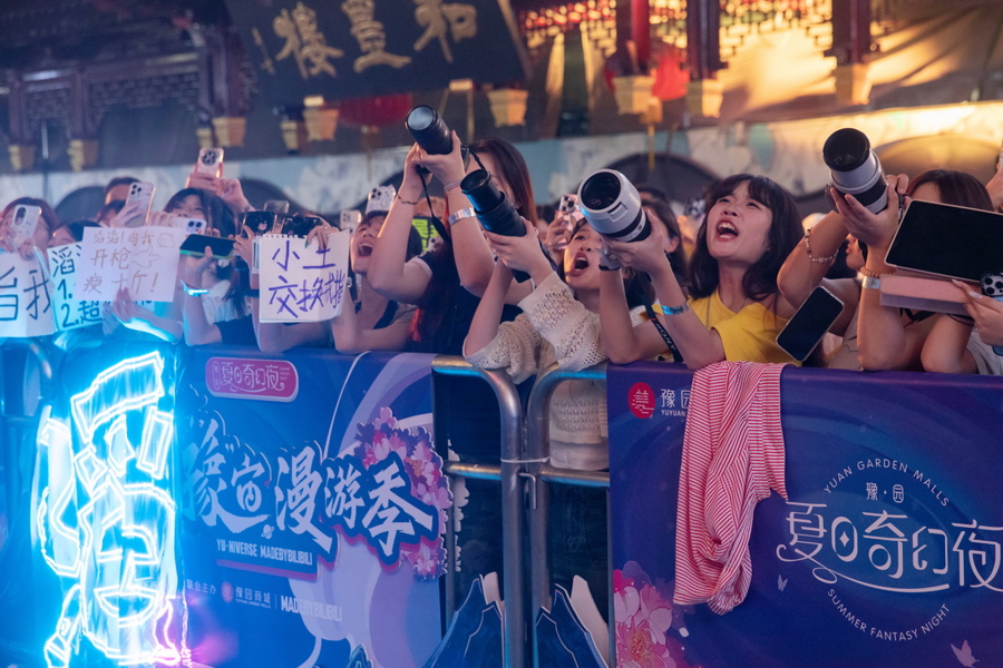 7月15日晚,700年历史的豫园老城厢与二次元破壁共舞。00后唱作人吴垚滔演绎动漫主题曲,引来年轻人的尖叫。