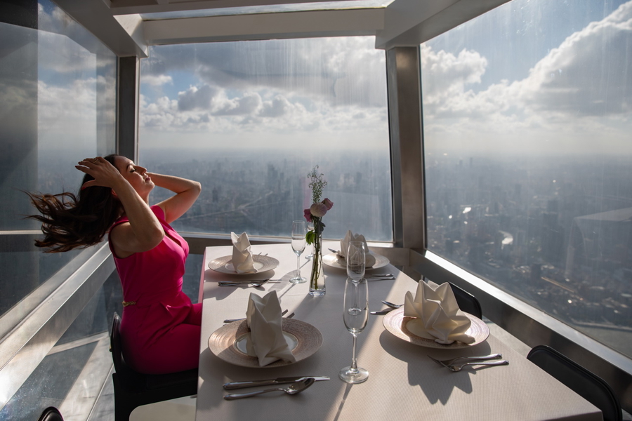 7月23日,上海中心大厦561米高空的半透明玻璃空间“天空·魔盒”内,顾客享用云端盛宴。