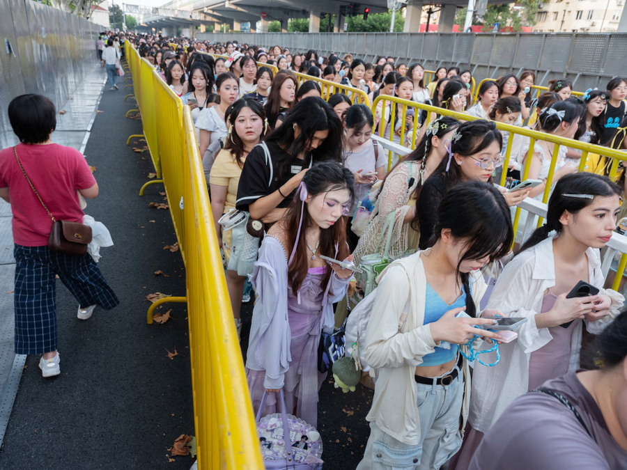 8月23日,观看时代少年团演唱会的女孩们排着长队进场,陪孩子追星的家长从旁边离开。每一代人都有自己的“小虎队”或“TFBOYS”。