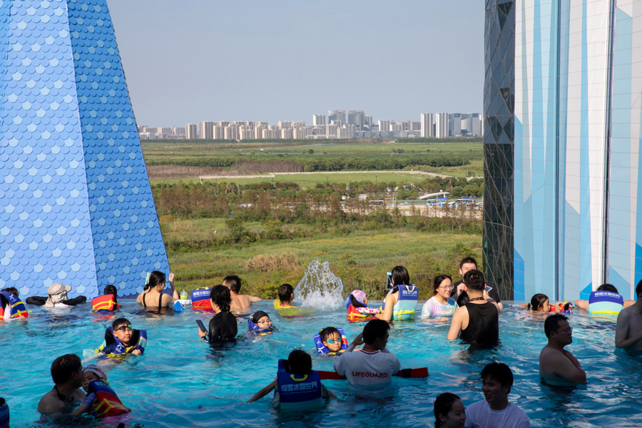 9月6日,耀雪水世界里,游客在无边泳池嬉戏的同时,还可欣赏郊区美景与城市风光。