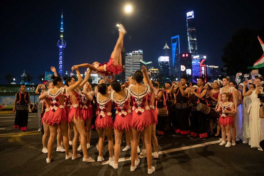 9月12日,上海旅游节大巡游彩排夜,匈牙利钻石健身运动队的队员们在外滩候场时展示高难度动作,引来其他队伍的阵阵喝彩。