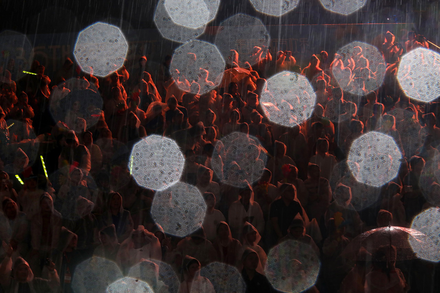 9月13日,上海旅游节大巡游活动启动,观众冒雨观看。