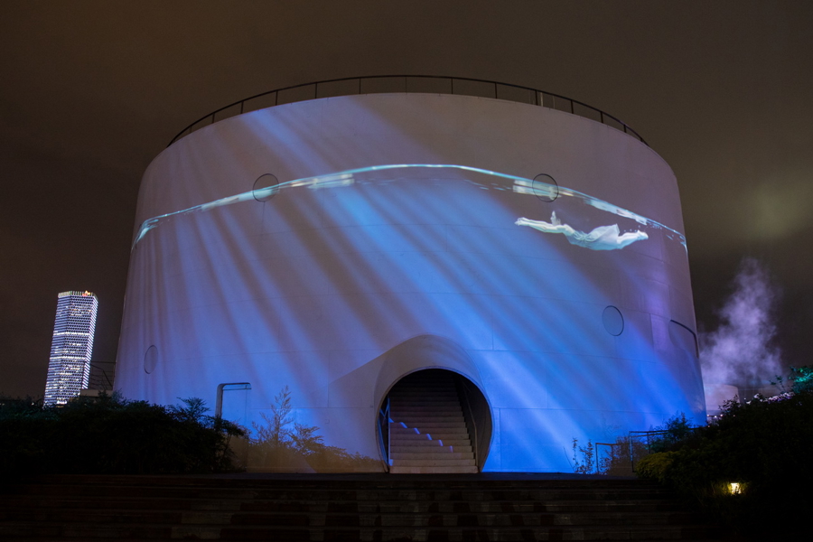9月17日,上海国际光影节,西岸油罐化身“大水池”,“女孩”在池中轻盈畅游。
