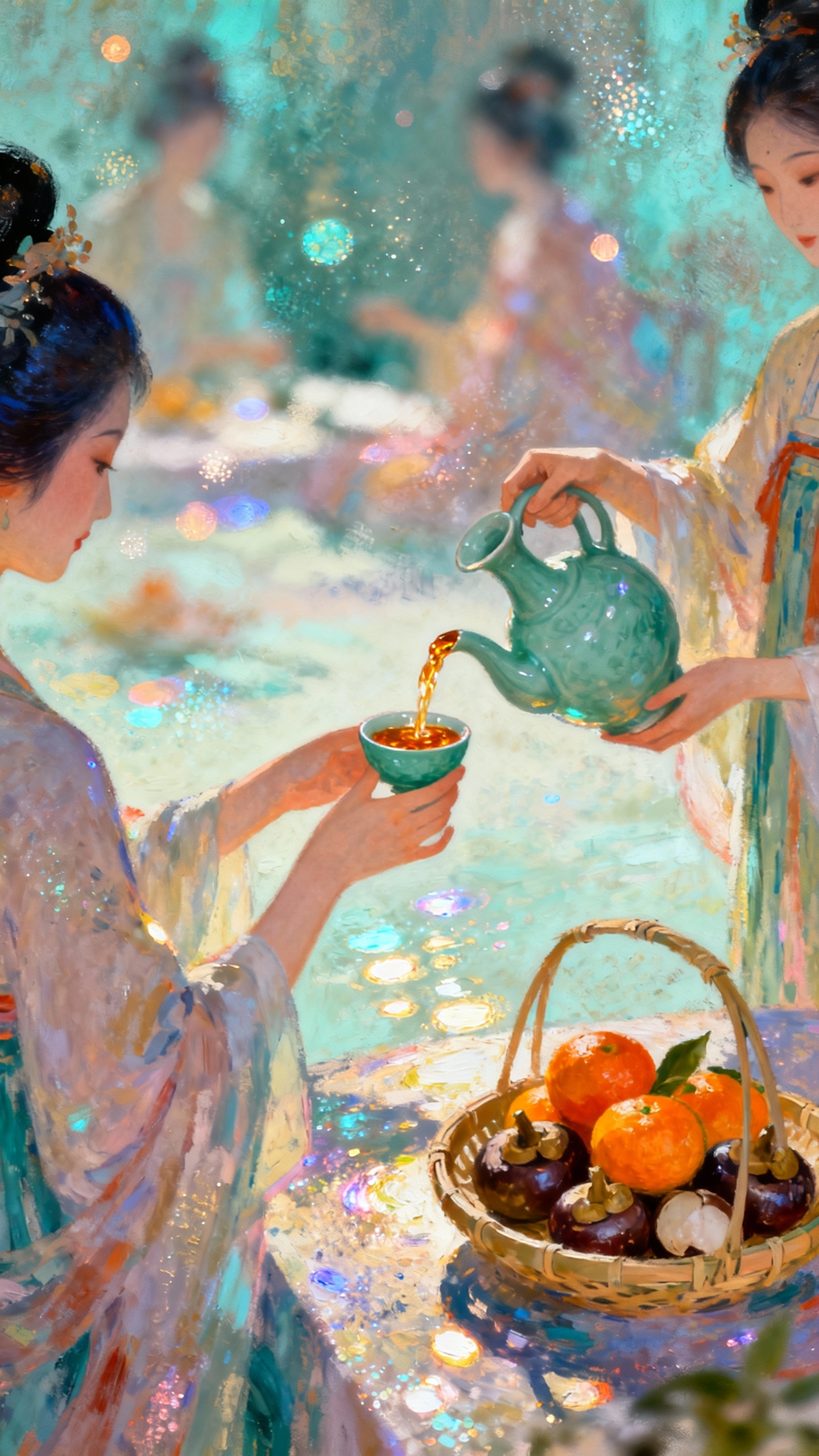 桌上的红烛一支接一支燃起,照着从厅堂这头延伸到那头的长长筵席。宾主举杯相邀,柏酒的清冽香气在空气中缓缓弥漫。画烛不熄,仿佛要拉住匆匆流转的光阴;长筵不散,好似能把这份团聚的暖意永远留住。