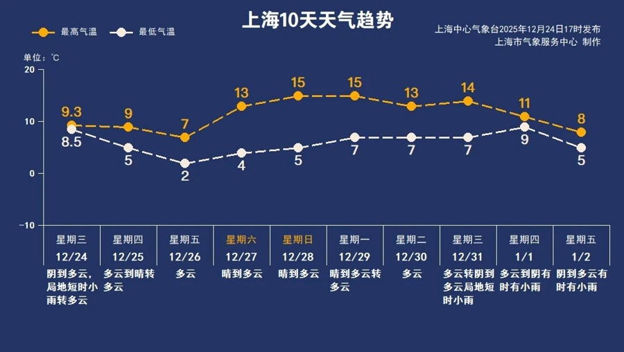受冷空气影响,上海今天(12月24日)普降小雨,金山吕巷镇雨量最大达4.5毫米。全天温差小,体感阴冷,市区徐家汇站最高气温仅9.3℃。目前,崇明、嘉定等区的寒潮蓝色预警仍在生效中。预计今天夜里逐渐雨止转多云。