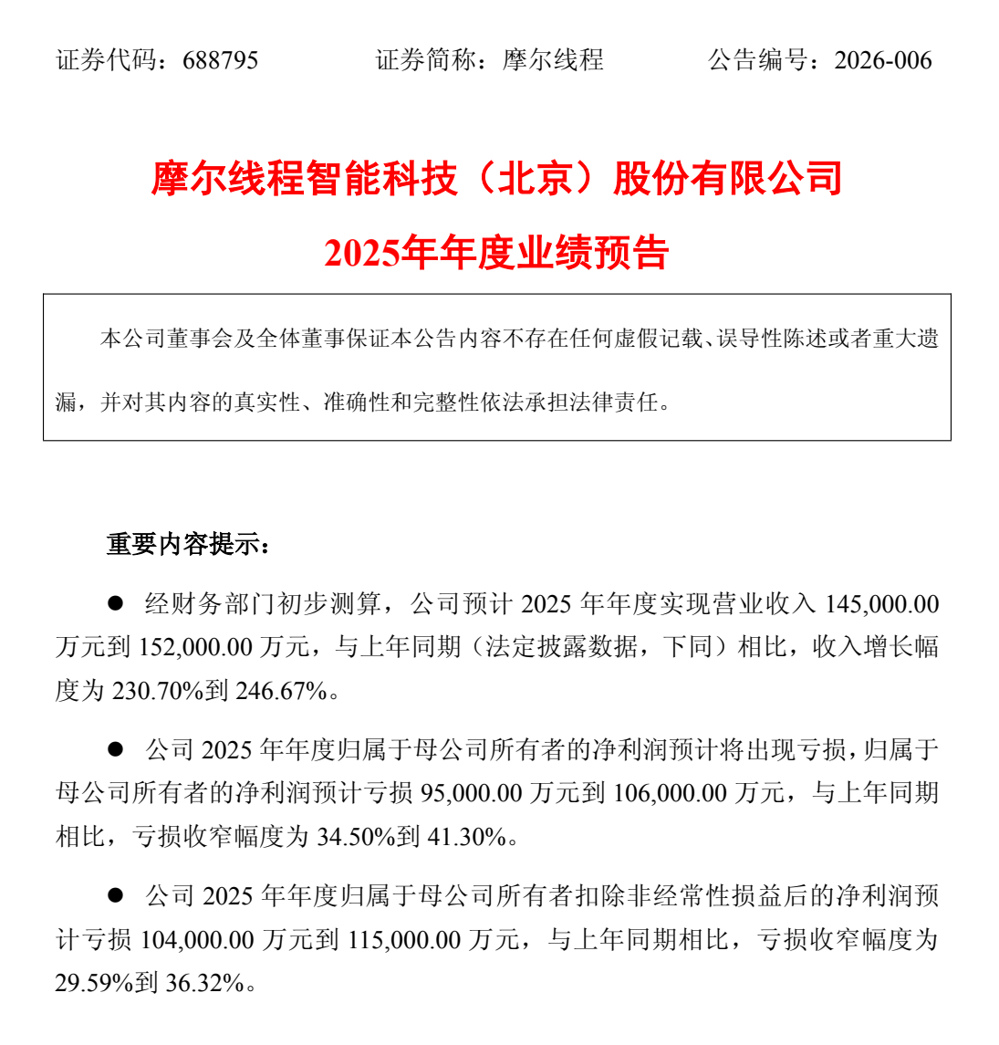 上证报中国证券网讯(记者郑维汉)1月21日晚,摩尔线程发布2025年度业绩预告,公司2025年营收预计为14.50亿元至15.20亿元,较2024年增长230.70%至246.67%。2025年扣非净利润预计亏损10.40亿元至11.50亿元,与上年同期相比,亏损收窄幅度为29.59%到36.32%。