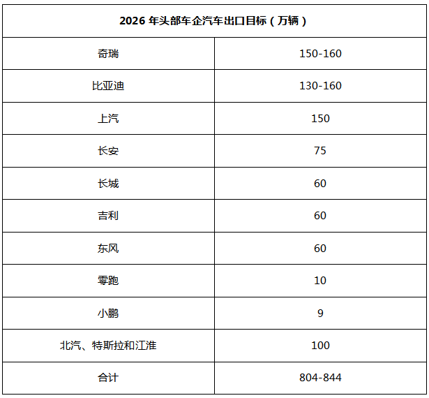 综合梳理头部车企今年的汽车出口目标,我们可以发现,车企进一步向海外市场发力的目标十分清晰。其中,比亚迪2025年海外销量达105.4万辆,2026年目标预计在130-160万辆,同比增长24.3%–50%;奇瑞2025年海外销量达134.4万辆,2026年目标预计在150万–160万辆,出口占比接近50%;上汽2025年海外销量107.1万辆,2026年目标预计在150万辆,增长约40%。同时,长安、长城、吉利、东风、小鹏和零跑2026年的出口目标合计也达到370万辆左右。此外,北汽、特斯拉和江淮虽然没有公布今年的出口目标,但结合2025年三家车企分别出口30.8万辆、22.6万辆和22.2万辆的成绩来看,今年三家车企的出口量合计也将在100万辆左右。由此,上述车企2026年出口目标合计已经远超800万辆,而这还不包括其他没有列入名单的车企。