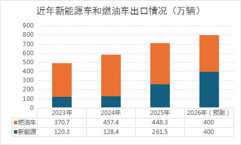 2025年,新能源汽车出口261.5万辆,同比增长103.7%,占据2025年汽车出口总量的36.8%,占比较2024年的21.9%和2023年的24.5%都有明显的提升。2025年,传统燃油汽车出口448.3万辆,同比下降2%,占据2025年汽车出口总量的63.2%,占比较2024年的78.1%和2023年的75.5%都有明显的回落。应该来讲,中国汽车的核心优势在新能源汽车,新能源汽车未来在中国汽车出口占比的提升态势仍将延续,今年有望达到400万辆;同时,燃油车的出口占比虽然未来有持续下滑空间,但毕竟基数相对较大,至少今年应该还能维持在400万辆的规模。