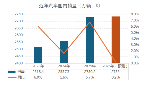 2025年,汽车国内销量虽然同比增长6.7%,达到2730.2万辆,但需要看到,这个销量的取得与去年实施的新能源汽车购置税优惠政策等有直接关系。面向2026年,一方面是相关优惠政策的力度退坡,另一方面是宏观经济形势上行趋势还不明显。即使按中国汽车工业协会预测今年汽车国内销量为2735万辆,其同比增长也仅0.2%。在我看来,今年国内汽车销量能维持在2700万量级就将是很不错的表现,甚至有可能回落到2600万辆左右,接近2024年2557.7万辆汽车国内销量的水平。因此,在国内汽车销量今年几无增量空间的背景下,汽车企业只能向海外市场发力。