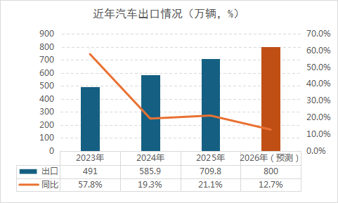 根据中国汽车工业协会的预测,2026年我国汽车出口将达到740万辆,同比增长4.3%,相较于2025年增加约30万辆。但在我看来,今年我国汽车出口有机会突破800万辆整数关口。